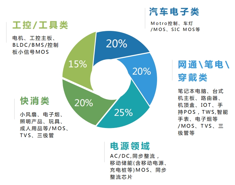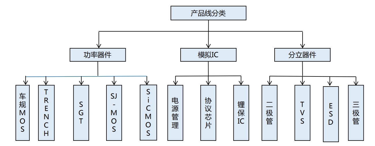 公司产品种类覆盖功率器件:TVS/ESD、小信号MOS、车规MOS、二三极管、SIC MOS、模拟IC等被广泛应用于家电 、PC/ 手机平板 、无线充快充 、移动电源 、储能系统 、 充电桩 、智能家居 、穿戴设备 、绿色照明 、健康医疗等行业 。
